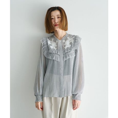 胸元のラッフルとレースの組み合わせが上品な甘さを演出するブラウス。