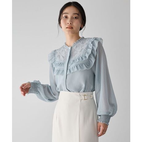 胸元のラッフルとレースの組み合わせが上品な甘さを演出するブラウス。