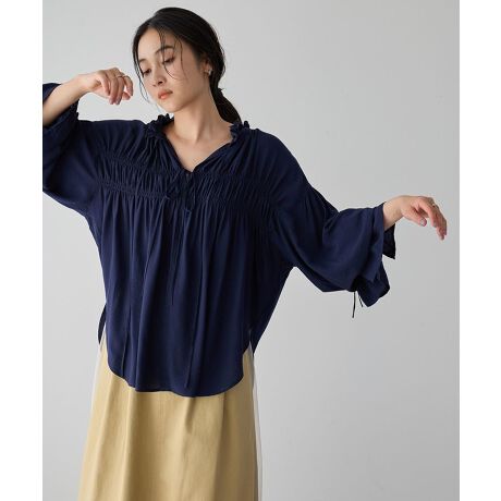 たっぷりのギャザーデザインと袖のシャーリングが印象的なブラウス。