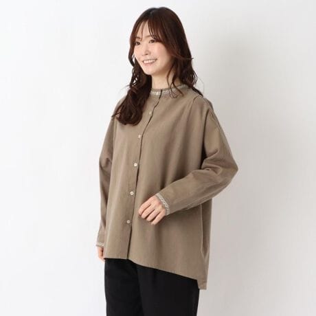 衿とカフスにあしらった小花刺繍が可愛らしいデザインポイント。後身頃の切替デザインもこの一枚に程よいアクセントを添えています。