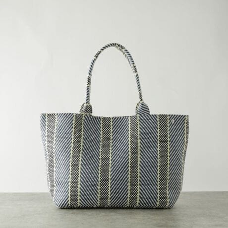 遊び心あふれるストライプデザインが特徴のトートバッグ。