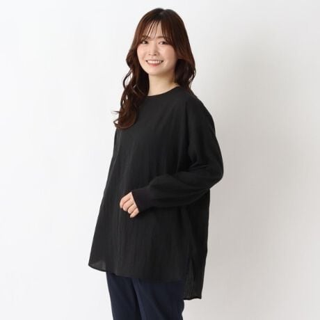 前後差のある丈と、ややゆとりのあるサイズ感で、気になる腰回りがすっぽり隠れるのも嬉しいポイント。