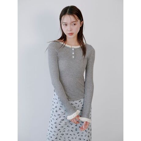背中を大胆に開けたデザインが目を引くヘンリーネックカットソー。薄手のテレコ素材を使用し、軽やかでフィット感のある着心地に仕上げました。カジュアルになりがちなカットソーを、衿ぐりと袖口にレーステープを施すことで、フェミニンなムードへと昇華。ワイドパンツやフレアスカートなど、幅広いアイテムと相性がよく、デイリーからちょっとしたお出かけスタイルまで活躍する一枚です。