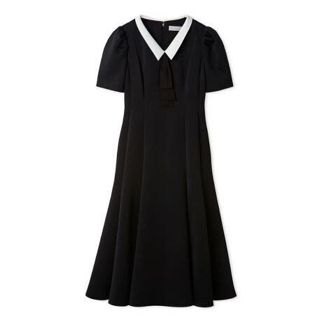 ウエストは自然にシェイプさせ、緩やかに広がる裾はポンチ特有のハリを活かしたマーメイドシルエットに。袖山はタックとギャザーでふんわりさせ、羽織りも合わせやすい半袖丈に設定。すっきりとしたVネックとシャープな細巾の衿で大人で上品な印象に仕上げました。