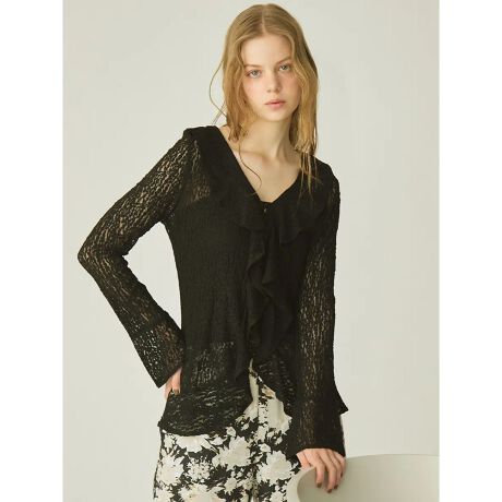 襟から前立てに続く、華やかで立体的なラッフルフリルが目を引くブラウス。