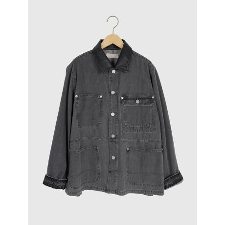 合成皮革生地の襟が全体を引き締め、デニムのラフさにモードな要素をプラスされたデザインが魅力です。