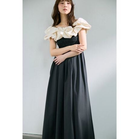 バルーンフリルがデコルテを華やかに彩るワンピース。