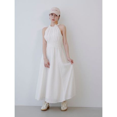 フリンジジャガード生地を使用した、華やかなアメリカンスリーブワンピース。存在感のあるバックリボンが後ろ姿を印象的に彩り、ネック部分には同素材のフリルを施して顔まわりをエレガントに演出します。ウエストはシャーリング仕様で、自然と体のラインを美しく見せてくれるのも嬉しいポイント。1枚で主役になるドレスライクなワンピースです。