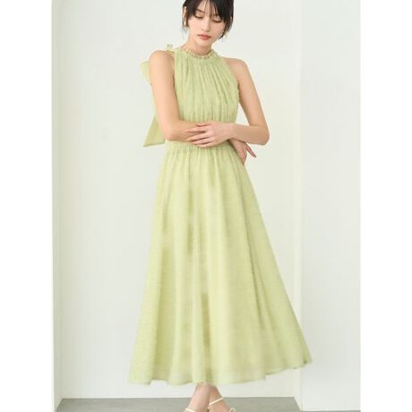 フリンジジャガード生地を使用した、華やかなアメリカンスリーブワンピース。存在感のあるバックリボンが後ろ姿を印象的に彩り、ネック部分には同素材のフリルを施して顔まわりをエレガントに演出します。ウエストはシャーリング仕様で、自然と体のラインを美しく見せてくれるのも嬉しいポイント。1枚で主役になるドレスライクなワンピースです。
