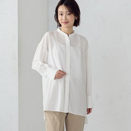 後ろ身頃のタックが特徴的なロングシャツです。