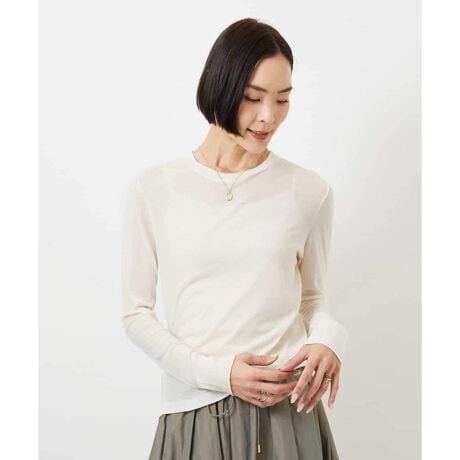 同じアイテムを2色重ねたレイヤードスタイルもおすすめ。ジャケットやカーディガンのインナーとしてはもちろん、ニットやブラウスに重ねて、襟元や袖口からさりげなく覗かせる着こなしも楽しめます。幅広いスタイリングに活躍する、汎用性の高い一枚です。 ※同素材を使用した半袖デザインもご用意しております。 シアークルーネック プルオーバー[FMKGD11120]