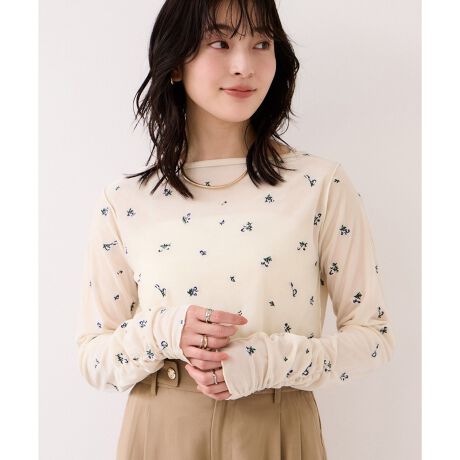 デコルテが綺麗に見えるコンパクトシルエットのロンTを今年らしく小花の刺しゅうで華やかに仕上げました。