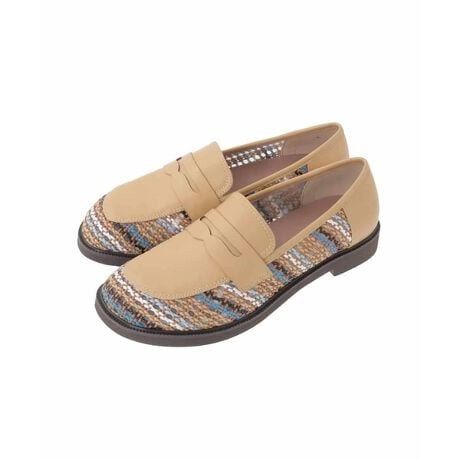 左右両側面にカラフルなメッシュ素材を使用した春夏らしいローファー。三色の糸をざっくり編み上げた表情豊かなデザインは、見ているだけで気分を上げてくれるほんのりレトロなホコモモラらしい一足です。柔らかな合成皮革で優しく足を包み込み、安定感のあるソールで歩きやすいのも魅力のポイント。素足で履いても、靴下を透かして覗かせても可愛い、アレンジ幅の広い靴です。デニムでカジュアルに合わせるのはもちろん、ロングスカートからチラッとメッシュを覗かせるのもおすすめです。