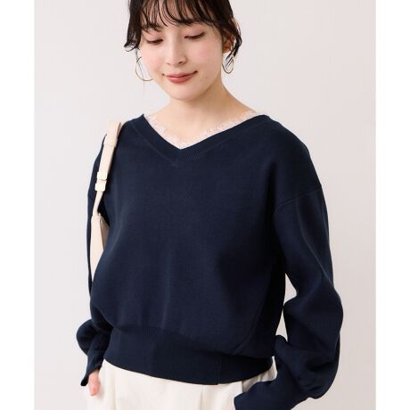 Vネック×衿元レースが一枚で抜け感のある華やぎを与えてくれるフェミニンなニット。