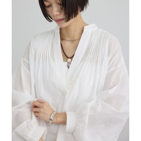 フロントに施した繊細なピンタックと、袖や背中のギャザーが上品で女性らしい印象を演出するブラウス。