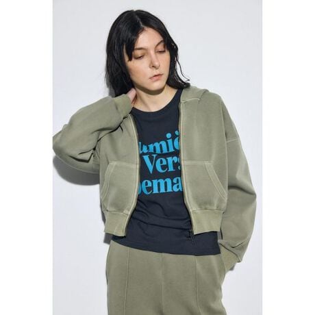 ■ピグメントダブルジップフーディー■ポイントピグメント加工がポイントのダブルジップのコンパクトなフーディー。■ディテールヴィンテージライクな加工を施していますが、ダンボール素材のためカジュアルすぎない質感がポイント。コンパクトなサイズ感でどんなボトムにも合わせやすいです。フードも大きめで小顔効果があります。袖口や裾はギャザーを寄せていて、ふわっとしたシルエットが女性らしいです。■スタイリング同素材のワイドパンツ(250JSB81-0671 ピグメントピンタックワイドパンツ)とセットアップ着用も可能です。ワイドボトムやハイウエストボトムとの相性が良いです。■生地程よく弾力のあるダンボール素材にピグメント加工を施しています。色の見え方やムラ、風合いには個体差がありますが、製品加工の特性です。透け感:なし裏 地:なし伸縮性:なし光沢感:なし[注意事項]※画像の商品はサンプルです。実際の商品と仕様、加工が若干異なる場合があります。※画像の商品は光の照射や角度、お使いのモニター環境により、実物と色味が異なる場合がございます。※着用、お取り扱いの際は、アテンションタグをご確認ください。