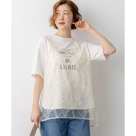 今シーズンのトレンドアイテムとして注目の、総刺繍デザインのキャミソールです。シンプルなシアー素材のカットソーやロゴTシャツに一枚重ねるだけで、いつものスタイリングが一気に華やぎ、洗練されたレイヤードスタイルが完成します。ふんわりとしたシルエットが気になるお腹周りをさりげなくカバーしてくれるのも嬉しいポイントです。肩ひもの長さはアジャスターで調整可能なので、合わせるボトムスのバランスに応じて着丈を変えられ、スカートからパンツまで幅広いコーディネートを楽しめます。カラーは、優しく上品な印象で馴染みの良いアイボリー(#002)と、シックでモードな雰囲気をプラスするブラック(#005)の2色展開です。