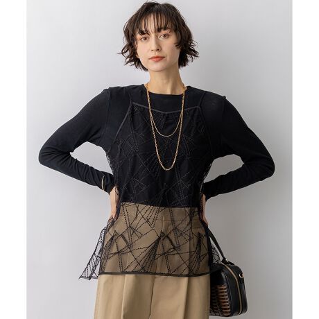 今シーズンのトレンドアイテムとして注目の、総刺繍デザインのキャミソールです。シンプルなシアー素材のカットソーやロゴTシャツに一枚重ねるだけで、いつものスタイリングが一気に華やぎ、洗練されたレイヤードスタイルが完成します。ふんわりとしたシルエットが気になるお腹周りをさりげなくカバーしてくれるのも嬉しいポイントです。肩ひもの長さはアジャスターで調整可能なので、合わせるボトムスのバランスに応じて着丈を変えられ、スカートからパンツまで幅広いコーディネートを楽しめます。カラーは、優しく上品な印象で馴染みの良いアイボリー(#002)と、シックでモードな雰囲気をプラスするブラック(#005)の2色展開です。
