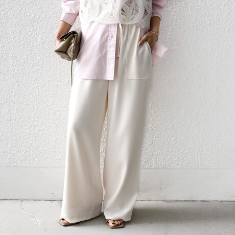 ウエストをドロスト仕様にしたリラックス感と女性らしい柔らかさを添えるベイカードロストパンツ。