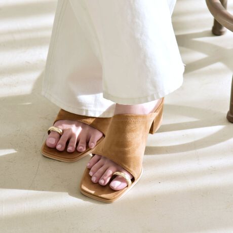 親指部分のゴールドのサムリングデザインが目を惹く、ヒールのスライドサンダル。