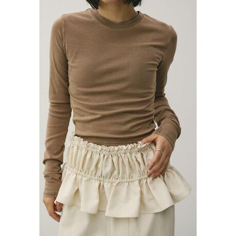 BEG:モデル身長163cm(Mサイズ着用)BLK,L/BRN,BLU:モデル身長166cm(Mサイズ着用)パウダーブリーチ加工で程よい抜け感を出したトップス。テンションのあるフィット素材を使用しており、身体に沿うシルエットがトレンド感を演出します。加工感のある生地がこなれた印象をプラスし、デイリーコーデからトレンドスタイルまで幅広く活躍。1枚で主役になりつつ、レイヤードにも使いやすいアイテムです。透け感なし、ストレッチあり。【お手入れ方法】マシンウォッシュ可