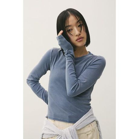 BEG:モデル身長163cm(Mサイズ着用)BLK,L/BRN,BLU:モデル身長166cm(Mサイズ着用)パウダーブリーチ加工で程よい抜け感を出したトップス。テンションのあるフィット素材を使用しており、身体に沿うシルエットがトレンド感を演出します。加工感のある生地がこなれた印象をプラスし、デイリーコーデからトレンドスタイルまで幅広く活躍。1枚で主役になりつつ、レイヤードにも使いやすいアイテムです。透け感なし、ストレッチあり。【お手入れ方法】マシンウォッシュ可