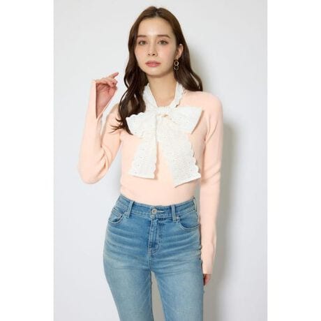 【コットンレースがドッキングされた春先に着たいニットトップス】■ポイントベーシックなリブ編みのニットに繊細な柄のコットンレースがドッキングされたトップスです。春先に着たくなるような程よいフェミニンさで、デイリー使いしやすいアイテムに仕上げました。■ディテール胸元には、リボンの存在感が出るように、程よいハリ感と幅があるコットンレースを使用しました。袖口にはスリットが入っているのでさりげない肌見せも叶います。■スタイリングミニボトム合わせでフェミニンムード高めるコーデがおすすめです。デニムパンツ合わせでカジュアルダウンしていただくのも◎■生地透け感:なし裏 地:なし伸縮性:あり光沢感:なし厚 さ:中肉■商品のお気に入り登録お気に入りアイテムの再入荷・在庫1点などの通知を受け取ることができます。[注意事項]※画像の商品はサンプルです。実際の商品と仕様、加工が若干異なる場合があります。※画像の商品は光の照射や角度、お使いのモニター環境により、実物と色味が異なる場合がございます。※着用、お取り扱いの際は、アテンションタグをご確認ください。
