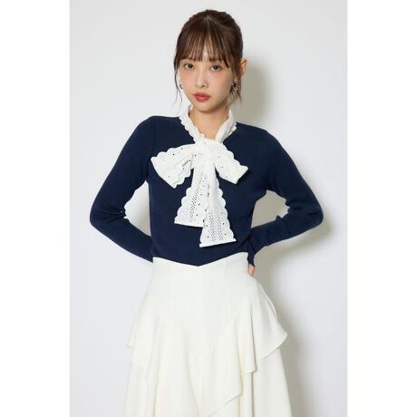 【コットンレースがドッキングされた春先に着たいニットトップス】■ポイントベーシックなリブ編みのニットに繊細な柄のコットンレースがドッキングされたトップスです。春先に着たくなるような程よいフェミニンさで、デイリー使いしやすいアイテムに仕上げました。■ディテール胸元には、リボンの存在感が出るように、程よいハリ感と幅があるコットンレースを使用しました。袖口にはスリットが入っているのでさりげない肌見せも叶います。■スタイリングミニボトム合わせでフェミニンムード高めるコーデがおすすめです。デニムパンツ合わせでカジュアルダウンしていただくのも◎■生地透け感:なし裏 地:なし伸縮性:あり光沢感:なし厚 さ:中肉■商品のお気に入り登録お気に入りアイテムの再入荷・在庫1点などの通知を受け取ることができます。[注意事項]※画像の商品はサンプルです。実際の商品と仕様、加工が若干異なる場合があります。※画像の商品は光の照射や角度、お使いのモニター環境により、実物と色味が異なる場合がございます。※着用、お取り扱いの際は、アテンションタグをご確認ください。