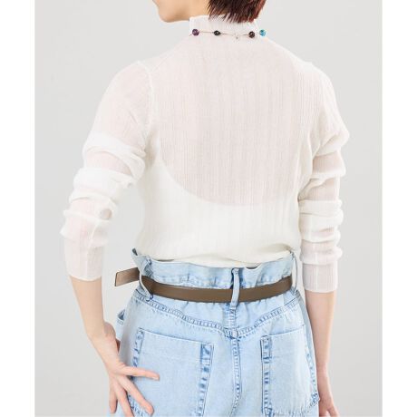 繊細な透け感がありながらも、リブ編みによる程よい存在感で、スタイリングに奥行きをプラスします。