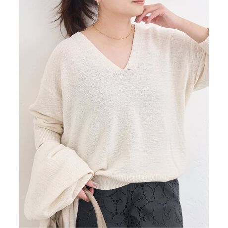首元は鎖骨が綺麗に覗く、絶妙な深さのVライン。横に少し広げることで、シャープになりすぎず、女性らしい柔らかなニュアンスを演出します。