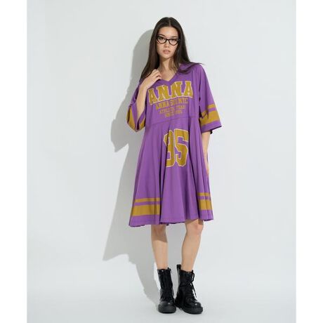 フロントには大胆なナンバリングとカレッジロゴプリントを施したスポーツTシャツワンピース。