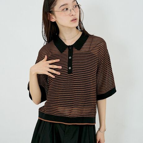 NOMINEのメッシュポロニットは、レーヨン89/ナイロン11のしなやかな編地で仕上げた夏向けニット。