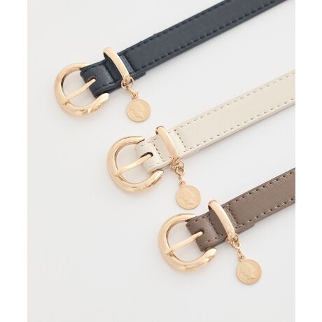細身の合成皮革ベルトに丸みのあるゴールドバックルと揺れるコインチャームをあしらったコインベルトは、手に取ると程よい艶と重みが感じられるアクセサリー感覚の一品です。スリム設計でウエストをさりげなく引き締め、デニムやワンピースに控えめな華やぎをプラスして普段の着こなしをグッと格上げします。ハイウエストジーンズのベルトループに通してカジュアルに、ニットやワンピの上からウエストマークしてフェミニンにと、着回しの幅が広がる万能アイテムです。