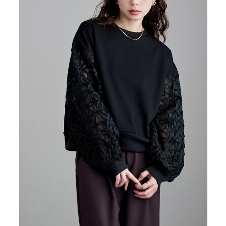 シアーなフラワー刺繍が印象的なチュール袖を組み合わせた、存在感のある一枚です。