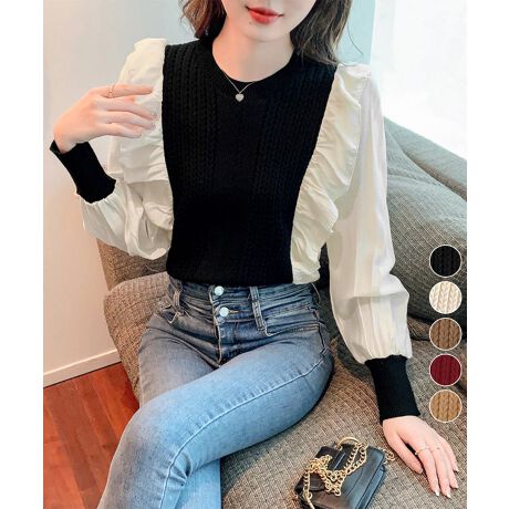 ボリュームスリーブが旬のアクセントになる、異素材mixのニットトップス。