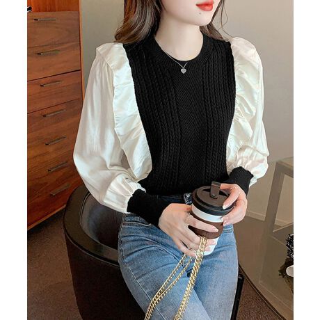 ボリュームスリーブが旬のアクセントになる、異素材mixのニットトップス。