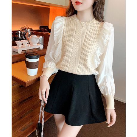 ボリュームスリーブが旬のアクセントになる、異素材mixのニットトップス。