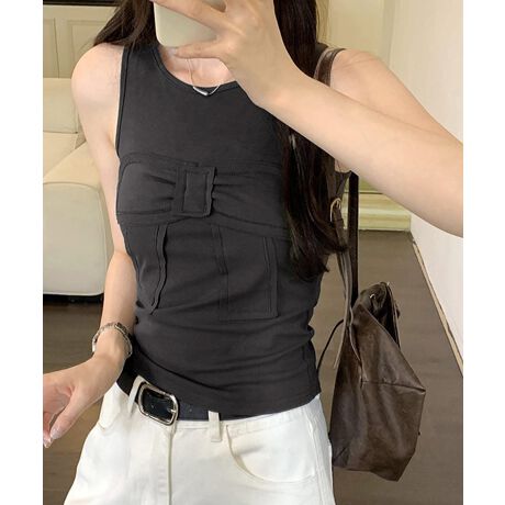 フロントに大きなリボンがアクセントの無地タンクトップ。