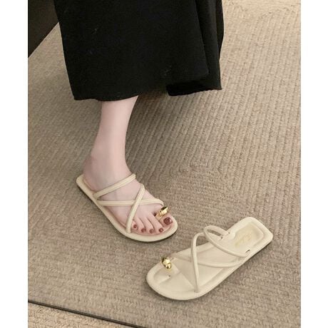 指部分にリング状のトングが付き、甲部分でクロスする細いストラップが特徴のフラットサンダル。