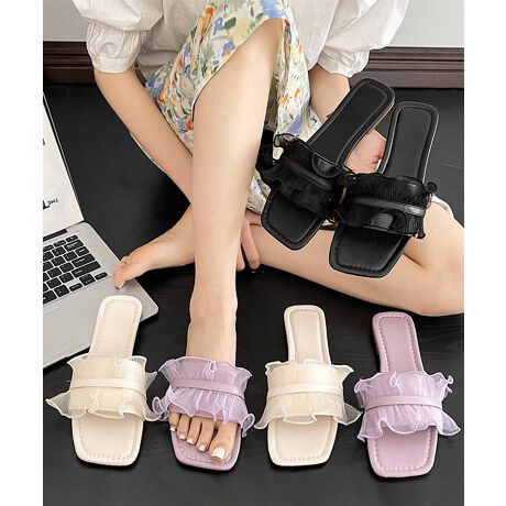 シアー素材のフリルデザインが可愛らしい印象を与えるフラットミュールサンダル。