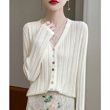 Vネックとカラフルなボタンがアクセントになり、程よいきちんと感と抜け感をプラス。