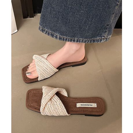ラフィア調の編み込みデザインが涼しげな、レディースフラットミュールサンダル。