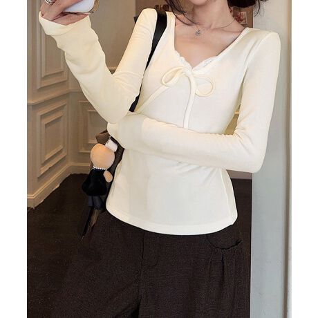 レースのネックラインとフロントリボンが可愛らしい、フェミニンな長袖トップス。