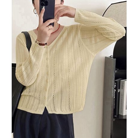 美しい縦ラインが際立つ、透かし編みデザインのVネックニットカーディガン。