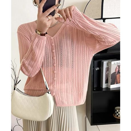 美しい縦ラインが際立つ、透かし編みデザインのVネックニットカーディガン。