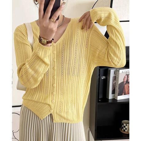 美しい縦ラインが際立つ、透かし編みデザインのVネックニットカーディガン。