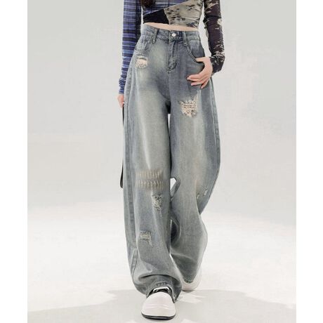 アメリカンヴィンテージテイストを取り入れた、ダメージ加工入りのレディースデニムワイドパンツ。
