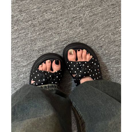 大きめのクロスリボンがアクセントになった、ドット柄の厚底サンダル。