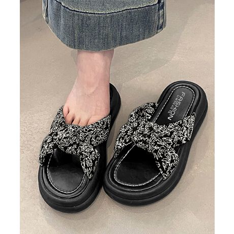 大きめのクロスリボンがアクセントになった、ドット柄・花柄の厚底サンダル。