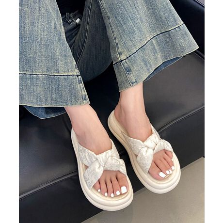 大きめのクロスリボンがアクセントになった、ドット柄・花柄の厚底サンダル。